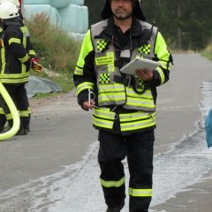 Umgehend wurde durch die Führungsunterstützung, die mit dem Einsatzleitwagen vor war, die weiteren Kräfte nachalarmiert. In der Halle wurden zudem 5 Personen vermisst. Nachdem eine Wasserversorgung aufgebaut und die Personen aus der Halle gerettet waren stellte der Angriffstrupp fest, dass ein Gefahrstoff aus einem Behälter austrat. Der Stoff war schnell identifiziert und konnte aus dem Gefahrenbereich gebracht werden.