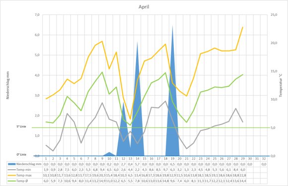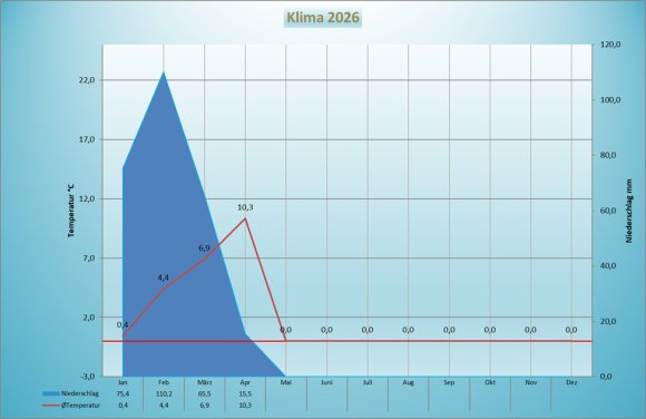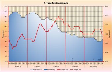 Neben vielen Wolken zeitweise auch Sonne, am späten Abend vereinzelt etwas Regen. Die Temperaturen bewegen sich zwischen 2° und 12°C. Der Wind weht schwach bis mäßig aus wechselnden, meist nordwestlichen Richtungen.