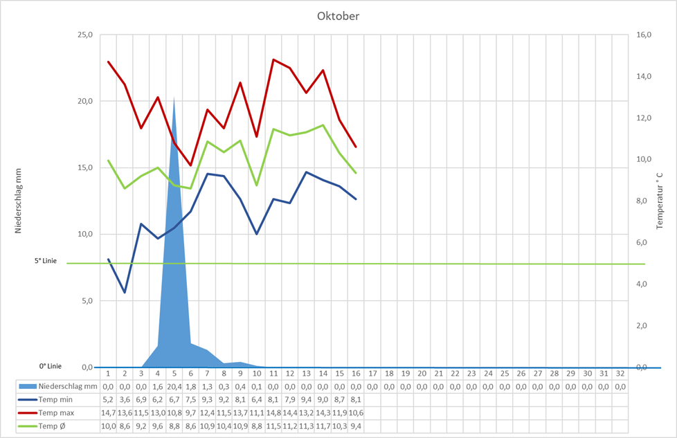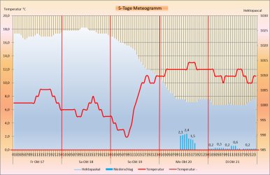 Weiterhin mildes, aber oft trübes Herbstwetter. Im Tagesverlauf regional auflockernde Bewölkung und hie und da Sonne. Niederschläge fallen kaum, örtlich Nieselregen. Die Höchsttemperaturen bewegen sich um 13° C. Schwacher Wind aus nördlichen Richtungen.