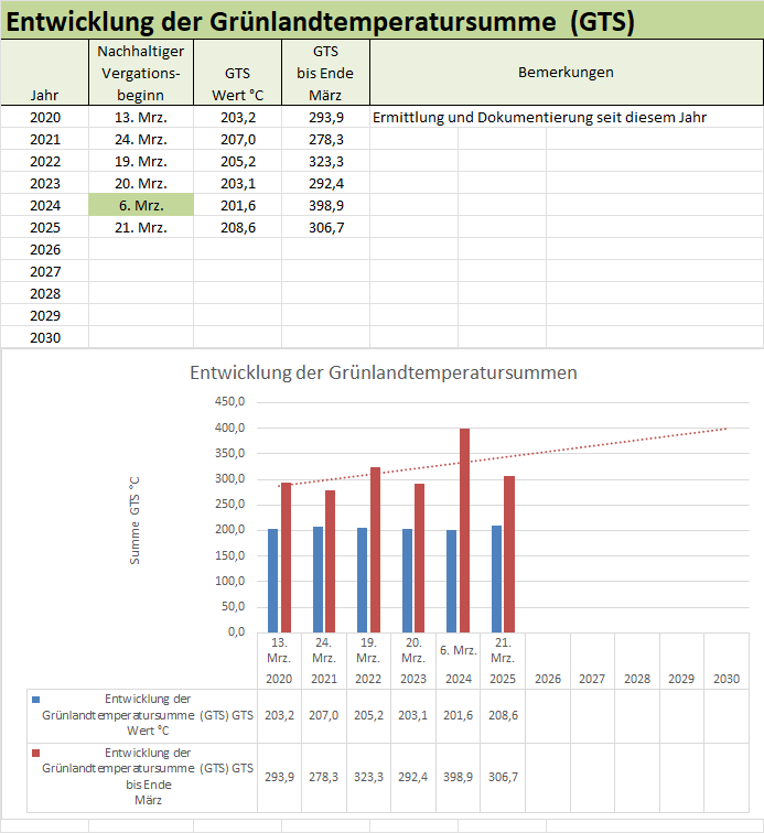 Die Entwicklung der Grünlandtemperatursumme (GTS) zeigt die folgende Grafik