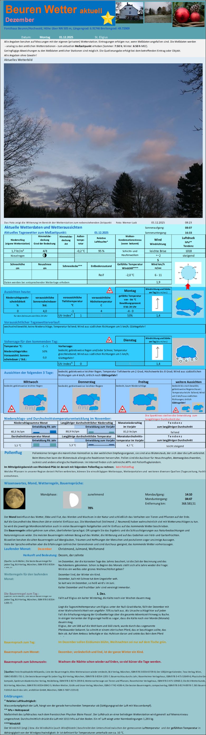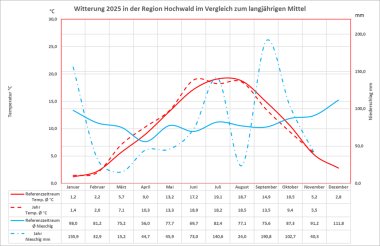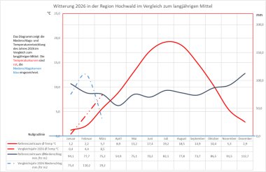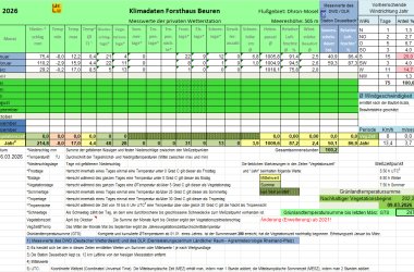 Die nachfolgende Tabelle "Klimadaten Forsthaus Beuren" listet die relevanten Klimadaten des laufenden Jahres nach Monaten auf. Die Tabelle wird fortlaufend aktualisiert. Eine Erklärung der Fachbegriffe finden Sie am Ende der Tabelle. Summen und Mittelwerte werden für das gesamte Jahr und die Vegetationsperiode (April bis Oktober) erhoben.