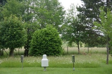 Die Niederschlagsmessgeräte der Wetterstation. Links ist der Niederschlagsmesser des DWD zu sehen. In der Mitte sehen Sie den automatischen Niederschlagsmesser des Dienstleistungszentrums ländlicher Raum Rheinland-Pfalz (DLR) und rechts den der privaten Wetterstation.