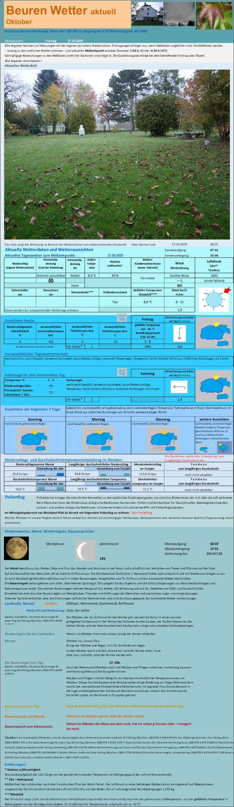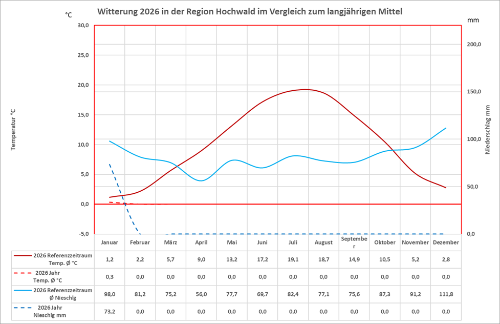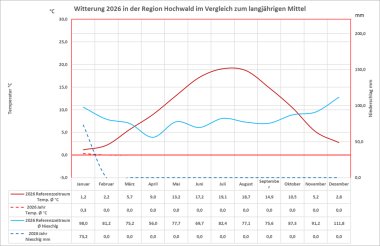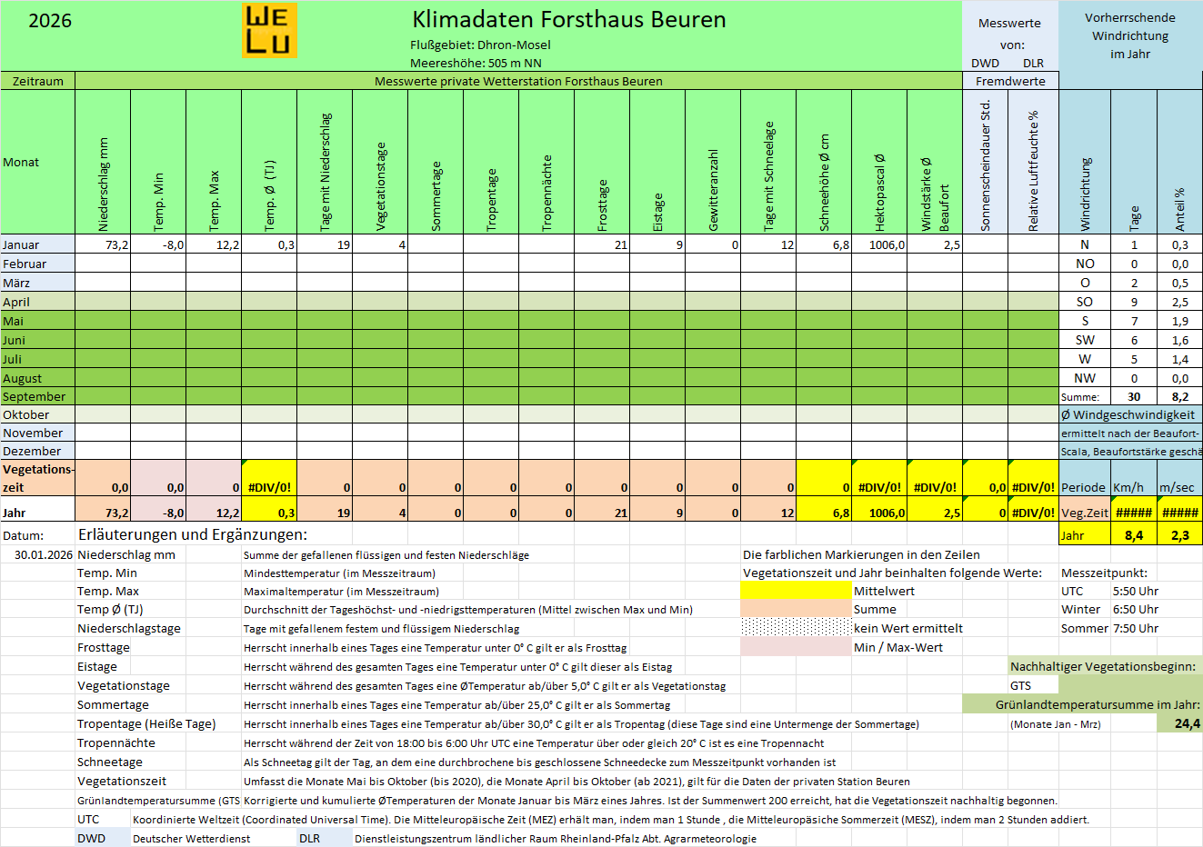 Die nachfolgende Tabelle "Klimadaten Forsthaus Beuren" listet die relevanten Klimadaten des laufenden Jahres nach Monaten auf. Die Tabelle wird fortlaufend aktualisiert. Eine Erklärung der Fachbegriffe finden Sie am Ende der Tabelle. Summen und Mittelwerte werden für das gesamte Jahr und die Vegetationsperiode (April bis Oktober) erhoben.